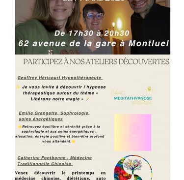 Au cours de cette soirée, vous profiterez de divers ateliers afin d'expérimenter nos diverses pratiques d'accompagnement telles que la médecine traditionnelle chinoise, la sophrologie ou encore l'hypnose thérapeutique.